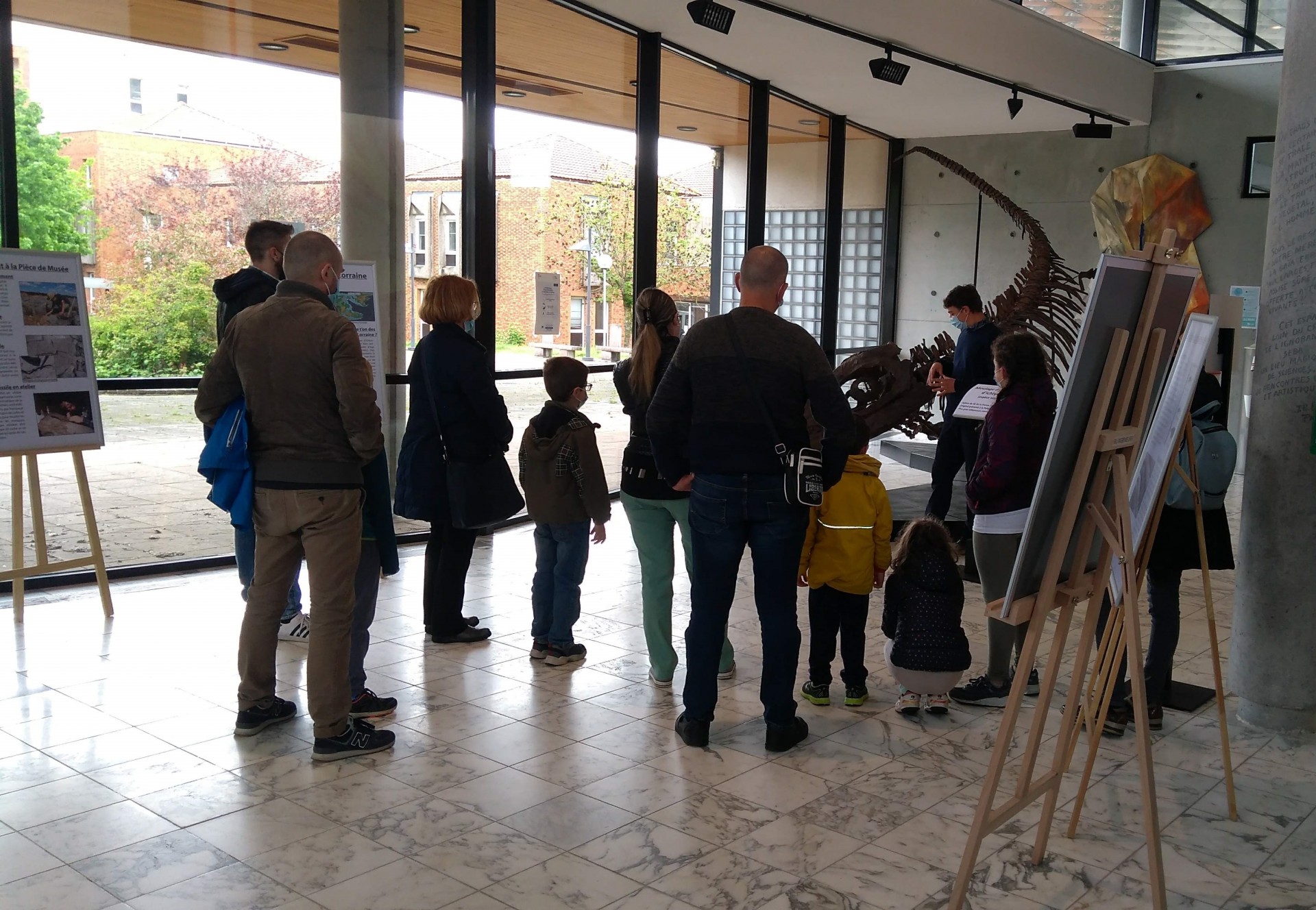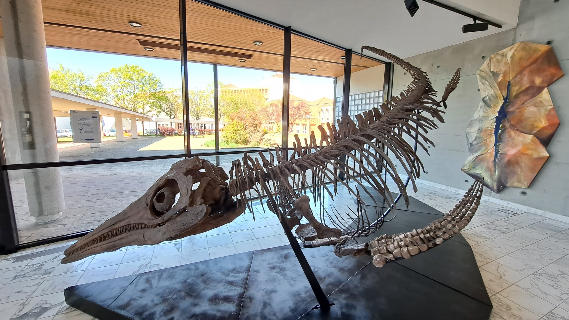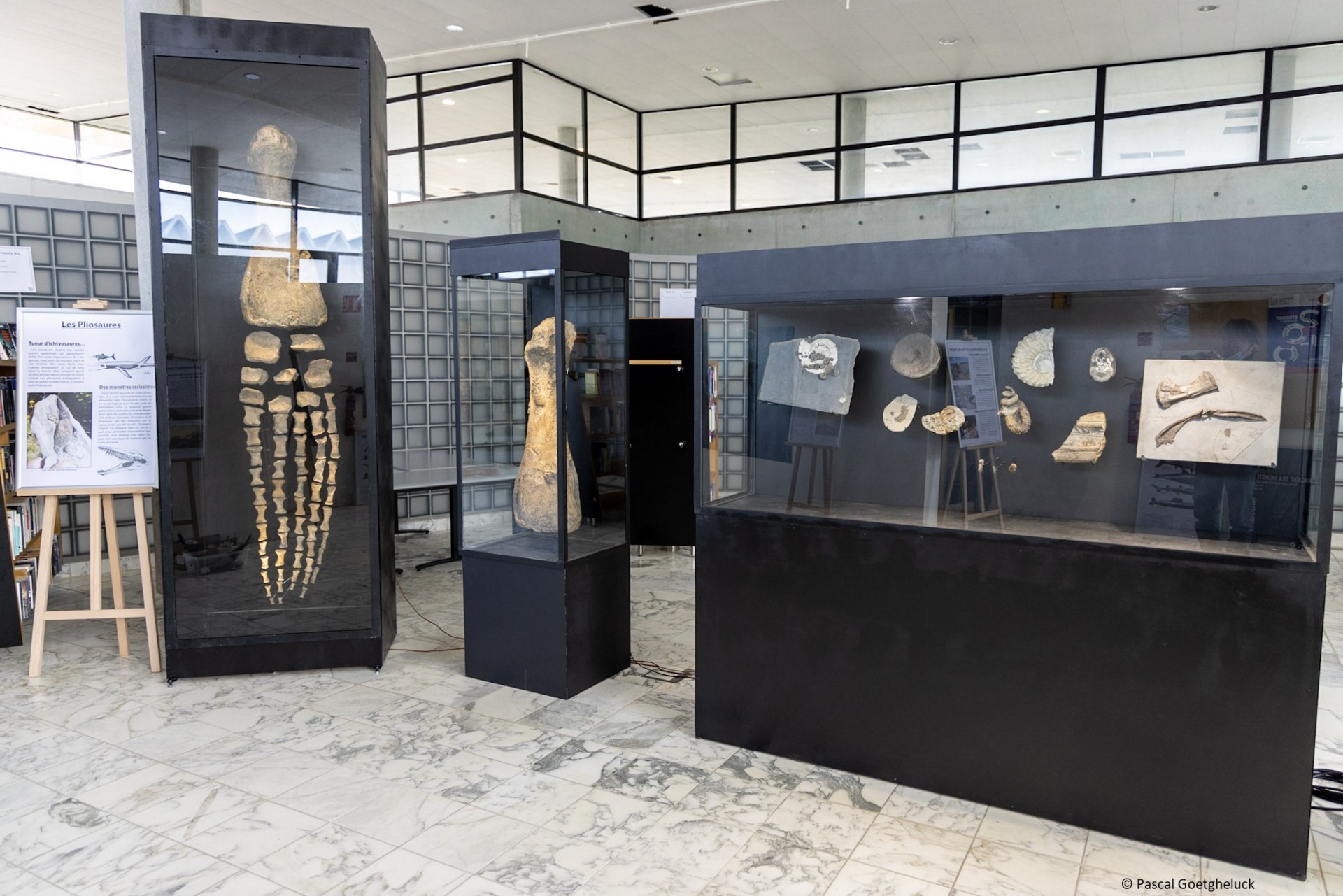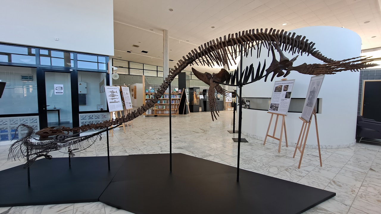 Pendant trois mois, d’avril à juin 2021 et avec le concours de l’ENSG, la bibliothèque ingénieurs Brabois s’est transformée en un petit musée ! Deux moulages de monstres marins ont ainsi pris place dans le hall de la bibliothèque, de même que des vitrines accueillant fossiles et pièces rares.