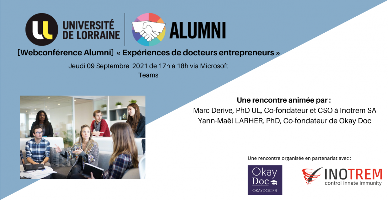 1. Marc DERIVE est co-fondateur et directeur scientifique de la société Inotrem. Il est Docteur en Immunologie de l'Université de Lorraine. Il a obtenu son Doctorat en immunologie en 2011 puis a développé son projet entrepreneurial avec l'Incubateur Lorrain en parallèle d'un contrat de chercheur postdoctoral à l'INSERM portant sur l'immunothérapie. Il partagera avec nous son expérience de création d'entreprise basée sur la recherche, les défis rencontrés dans son secteur d'activité et ses conseils pour les surmonter. Il nous exposera notamment les points clefs de ses tâches de gestion de la recherche en entreprise, ses points communs et ses différences avec la recherche publique. Nous aurons ainsi l'occasion de dialoguer ensemble sur la place et l'avenir des jeunes chercheurs dans les directions d'entreprises.
