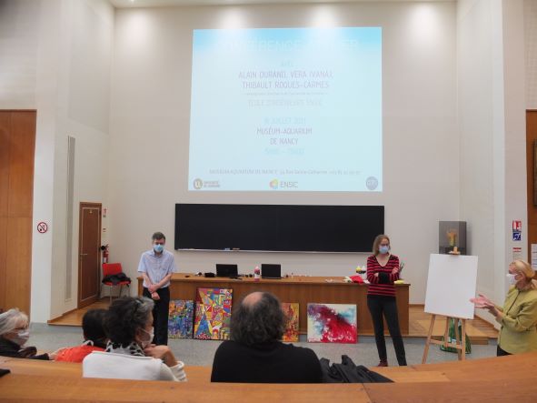 Le vendredi 16 juillet 2021, de 15h00 à 17h00, deux enseignants-chercheurs de l’ENSIC, Vera Ivanaj (CEREFIGE UR3942 Université de Lorraine) et Alain Durand (LCPM UMR7375 Université de Lorraine - CNRS), ont présenté une conférence-atelier intitulée « L’Art sort sa Science ». Vera Ivanaj est également artiste peintre et cela constituait le point de départ de la conférence. L’artiste et le scientifique interrogeaient tous les deux l’utilité de la peinture, l’un à travers ses propriétés d’usage et leur lien à sa composition, l’autre à travers l’expérience esthétique qui ressort de ses propriétés (texture, couleur, transparence…). En quoi les deux démarches se rejoignent, se distinguent, se stimulent ? C’était l’objet de la discussion qui fut ensuite suivie d’une partie « atelier » au cours de laquelle un certains nombre de points soulevés ont trouvé une traduction dans la réalisation d’une œuvre picturale en direct.