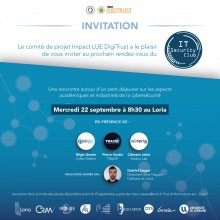 Le comité de projet Impact LUE DigiTrust vous propose un petit-déjeuner pour échanger autour des aspects académiques et industriels de la cybersécurité. Pour cette séance, l’avant et l’après cyber-attaques seront au centre de la discussion. Cet événement aura lieu le mercredi 22 septembre à 8h30 au Loria. Il sera animé par Gabriel Sauger, doctorant dans l’équipe Carbone du Loria, en présence de Régis Lhoste (Cyber-Detect), Pierre Veutin (TRACIP) et Clément Joliot (Soteria Lab).