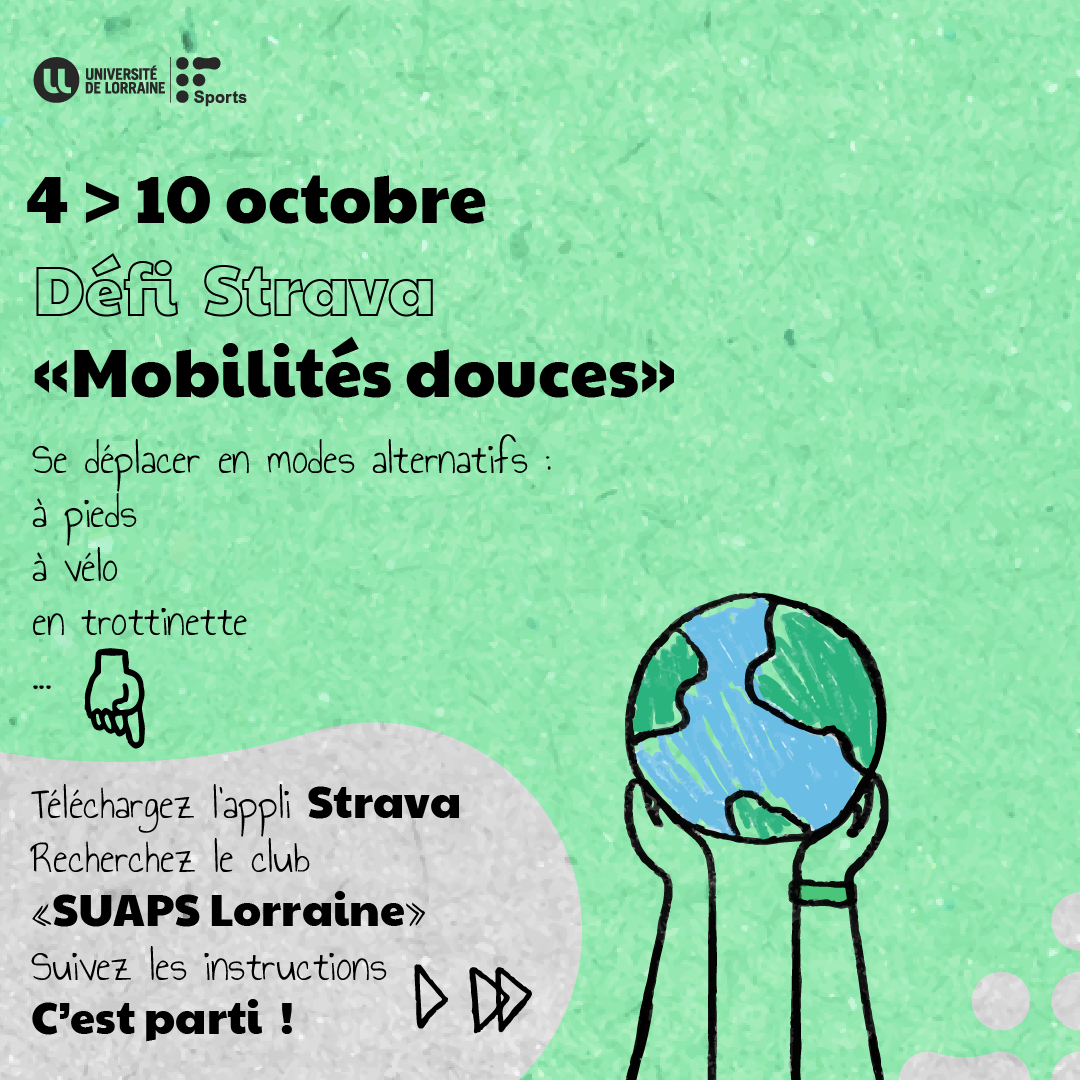 L’objectif ? Sur une semaine, parcourir un maximum de km en modes alternatifs (vélo, marche, trottinette, etc.) ! Et pourquoi ne pas garder ces nouvelles habitudes sur toute l’année ? Téléchargez l’application Strava et rejoignez le Club SUAPS Lorraine pour avoir toutes les informations sur ce challenge.