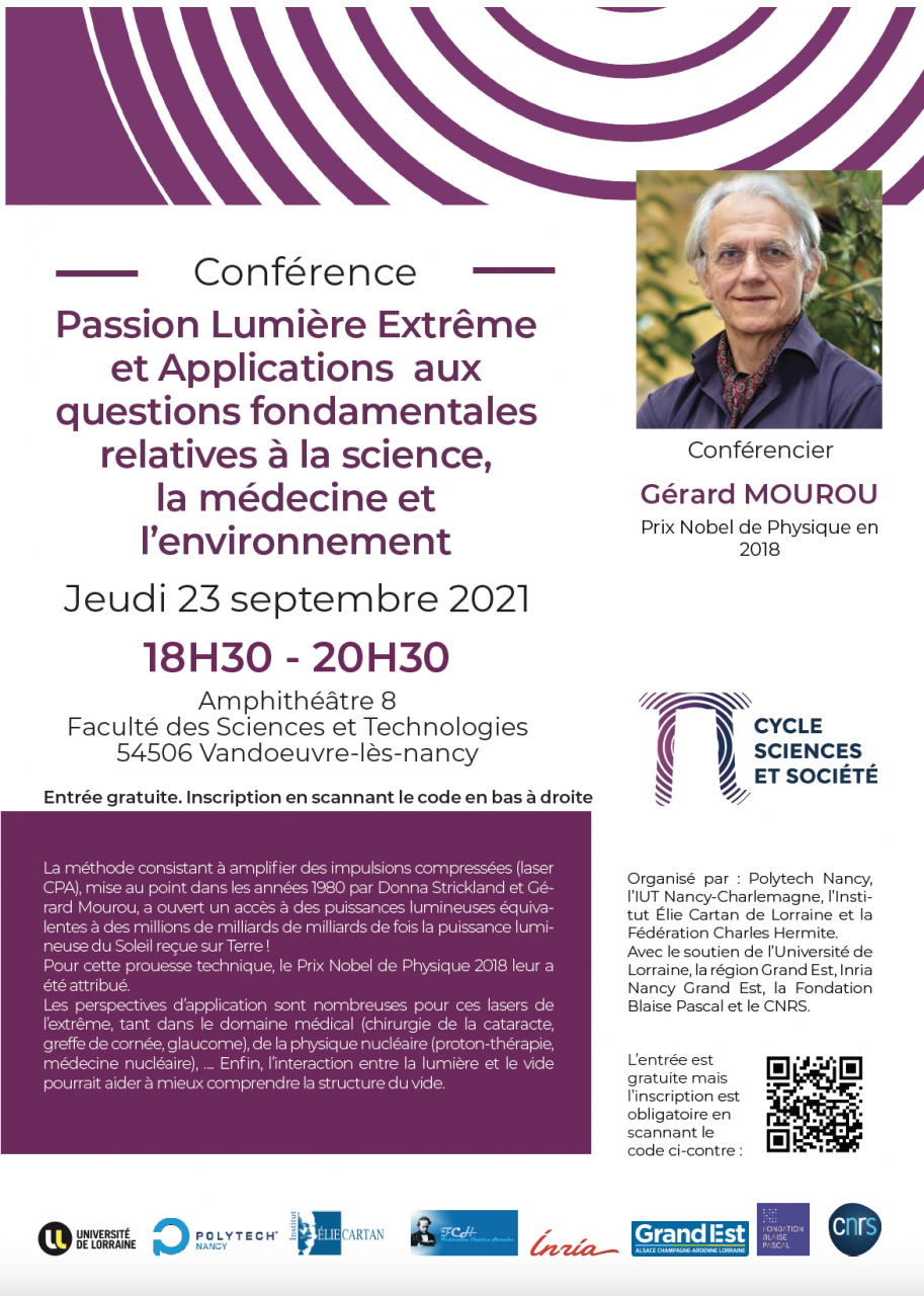 Gérard Mourou, professeur émérite, Prix Nobel de physique 2018, donnera une conférence jeudi 23 septembre 2021 dans l'amphithéâtre 8 de la Faculté des Sciences et Technologies à 18h30. Sa conférence s'intitule : Passion Lumière Extrême et applications aux sciences fondamentales, la médecine et l’environnement. L'entrée est libre mais l'inscription est obligatoire en cliquant sur ce lien.