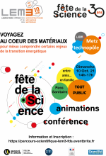 A l’occasion des 30 ans de la fête de la science et des 10 ans de création du LEM3, nos chercheurs vous proposent UN VOYAGE AU COEUR DES MATERIAUX : Pour mieux comprendre certains enjeux de la transition énergétique.