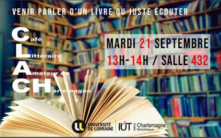 La rentrée du CLACh (Café Littéraire Amateur de Charlemagne) aura lieu ce mardi 21 septembre, de 13h à 14h, en salle 432.
