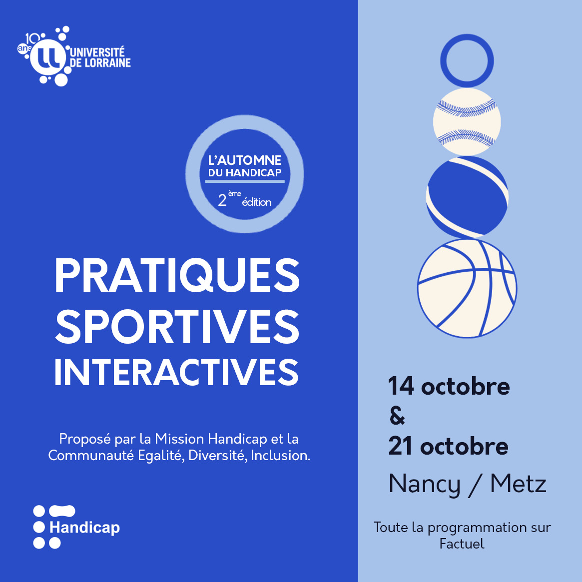 Découvrez les "pratiques sportives interactives" proposées par la Mission Handicap et la communauté Egalité, Diversité, Inclusion, dans le cadre de l'Automne du Handicap, en collaboration avec le SUAPS et les filières APAS/STAPS de Nancy et Metz.