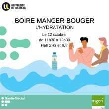 A l’occasion de notre première action en présentiel « Boire, Manger, Bouger », les étudiants relais-santé du SUMPPS vous invitent à venir passer un bon moment sur le thème de l’hydratation. On se retrouve le 12 octobre 2021, dans la joie et la bonne humeur de 11h30 à 13h30 dans les halls du bâtiment SHS et de l’IUT sur le campus du Saulcy.