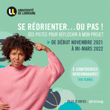 Pas de panique, l’Université de Lorraine vous accompagne dans la construction (éventuelle) d’un nouveau projet - à l’université ou en dehors - avec « Se réorienter … ou pas ! Des pistes pour réfléchir à mon projet ».