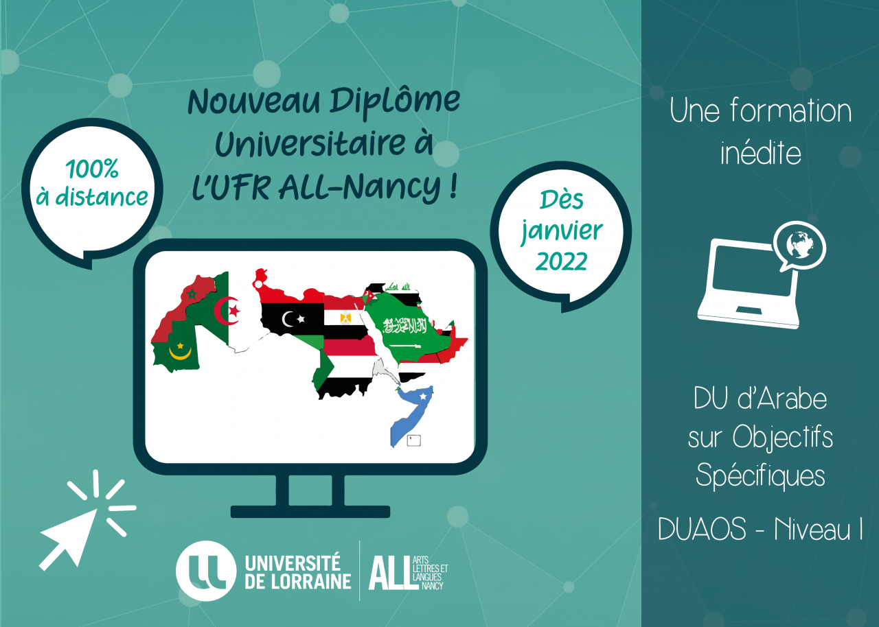 L’UFR Arts, Lettres et Langues (ALL) de Nancy propose un nouveau Diplôme Universitaire d’Arabe sur Objectifs Spécifiques (DUAOS), destiné à des étudiants qui souhaitent compléter une formation principale et à des professionnels.