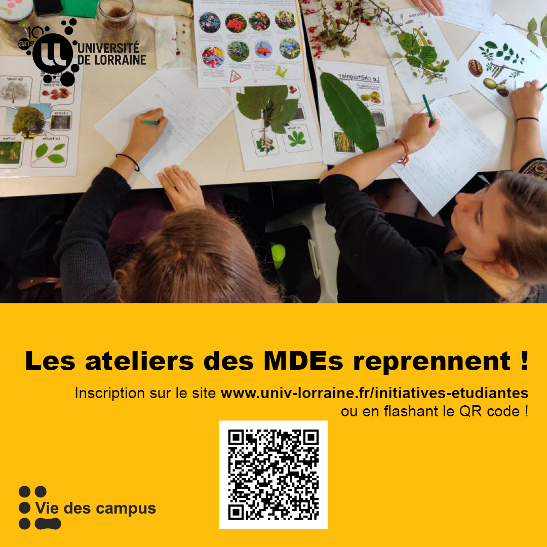 Les Maisons de l’étudiant Lorraine Nord (campus du Saulcy), Lorraine Sud (Campus Lettres et Sciences Humaines) vous proposent de nouveaux ateliers en présentiel.