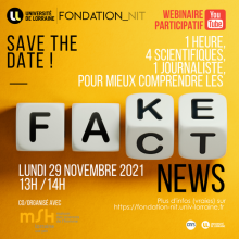 Cette table ronde sur le thème des fausses nouvelles, organisée par la fondation de l'Université de Lorraine et co-organisée avec la Maison des Sciences de l'Homme (MSH Lorraine), aura lieu le lundi 29 novembre 2021, de 13h à 14h en live sur la chaîne YouTube de MSH Lorraine ! Celle-ci sera donc disponible en replay sur cette même chaîne mais vos interrogations pourront être prises en compte durant le live grâce au tchat, ce webinaire étant participatif ! Rendez-vous ici pour cette table ronde !