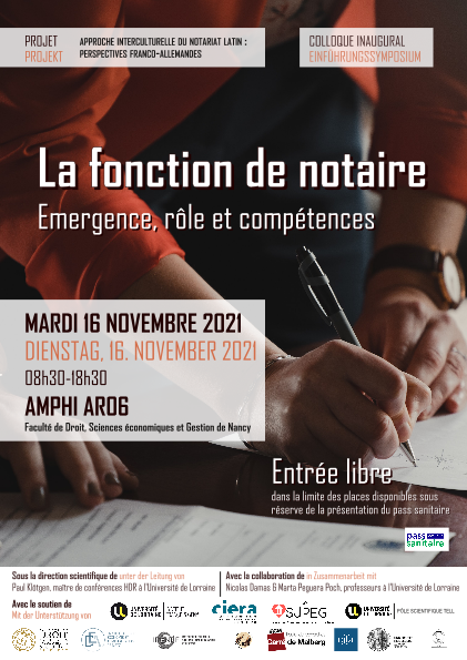 Des chercheurs des Universités de Lorraine (à Nancy et à Metz) et des Universités de Strasbourg, de Heidelberg et de Sarrebruck, sous l’impulsion de Paul Klötgen (maître de conférences HDR – Institut François Gény – Université de Lorraine), ont sollicité et obtenu le soutien du programme de formation-recherche (PFR) du Centre Interdisciplinaire d’études et de Recherches sur l’Allemagne (CIERA) pour la réalisation d’un projet intitulé "Approche interculturelle du notariat latin : perspectives franco-allemandes".