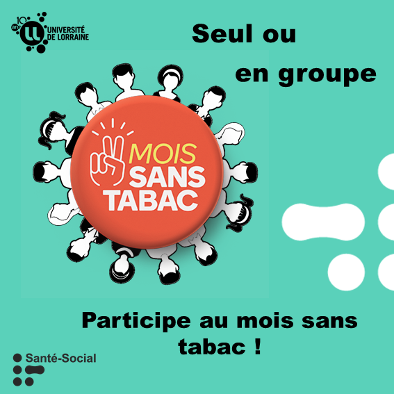 Pour poursuivre avec la reprise des actions en présentiel, les étudiants relais-santé du SUMPPS vous invitent à venir passer un bon moment sur le thème du "Mois sans tabac". On se retrouve les 10 et 18 novembre 2021, dans la joie et la bonne humeur de 11h30 à 14h30 dans les halls du bâtiment SHS et Simone Weil sur le campus du Saulcy.