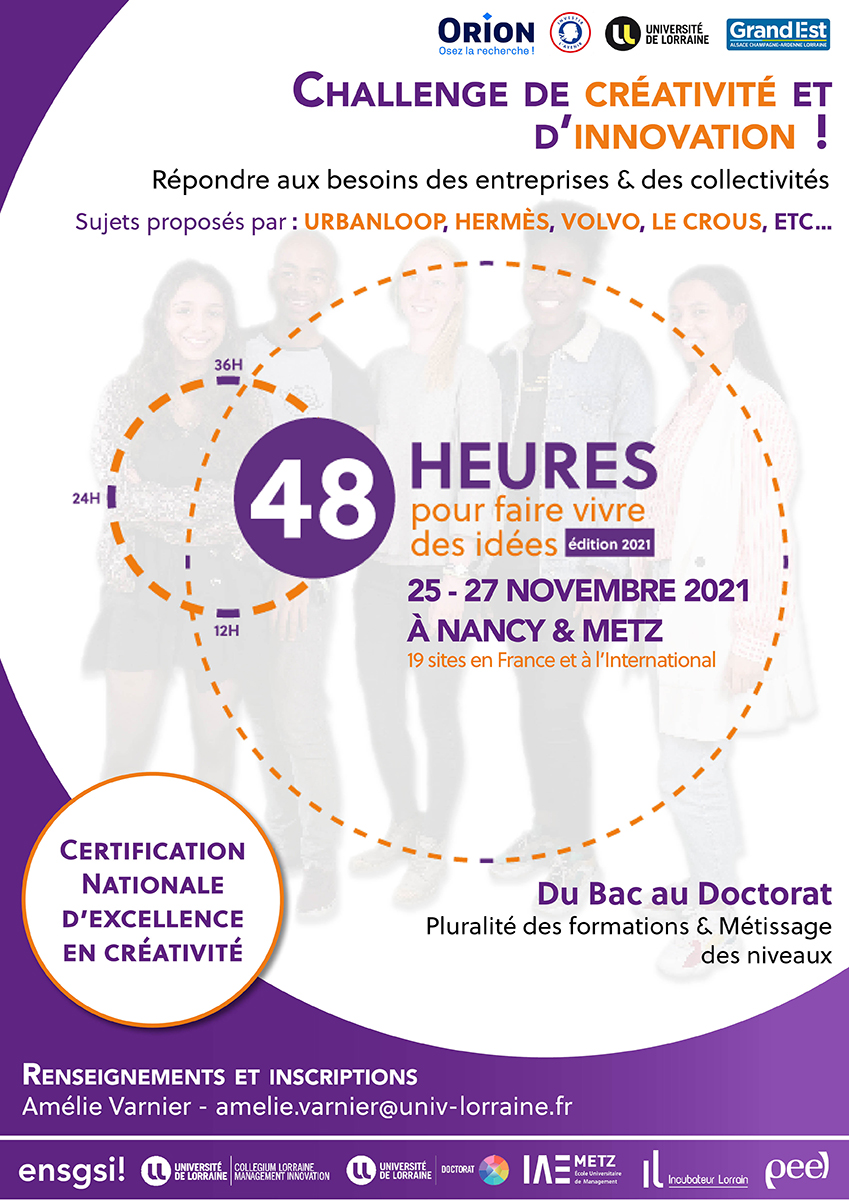Du jeudi 25 novembre au samedi 27 novembre prochains, 240 étudiants à Nancy (accueillis à l’ENSGSI) et 125 participants à Metz (accueillis à l’IAE Metz), se formeront aux basiques de la créativité collective, aux phases amont d’un processus d’innovation, ainsi qu’à un panel choisi de soft skills accompagnant chaque participant vers la connaissance de soi et de la dynamique d’équipe.