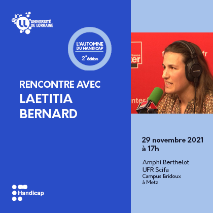 Cette rencontre est proposée par la mission handicap et la communauté Egalité-Diversité-Inclusion de l’Université de Lorraine à l'occasion de la seconde édition de l’Automne du Handicap, du 12 octobre au 3 décembre 2021.