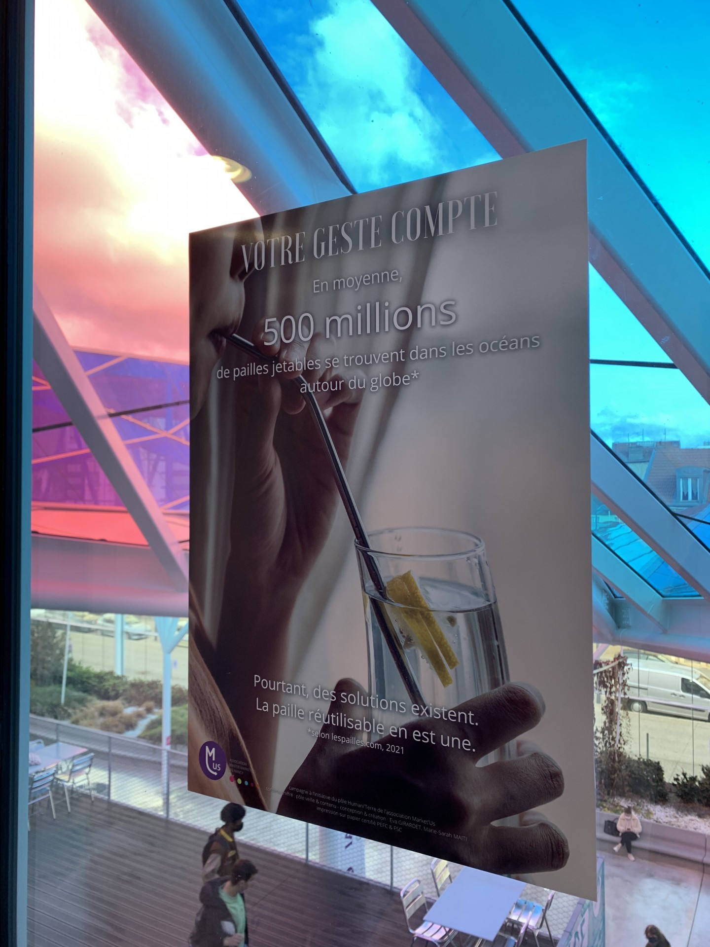 Chaque affiche comporte un éco-geste (réduire sa consommation de pailles en plastique ou encore utiliser une gourde plutôt que des gobelets en plastique lors de la pause café).