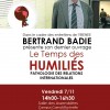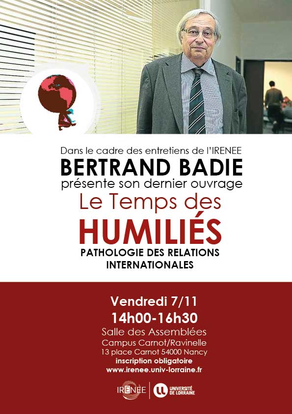 Bonjour à tous, Dans le cadre des entretiens de l'IRENEE nous avons le plaisir d'accueillir Bertrand Badiequi viendra nous présenter son dernier ouvrageLe temps des HUMILIÉSPathologie des relations internationalesOdile Jacob, 2014 Porteurs : Michel Mangenot et Jean-Denis MoutonVendredi 7 novembre 2014 de 14h à 16h30