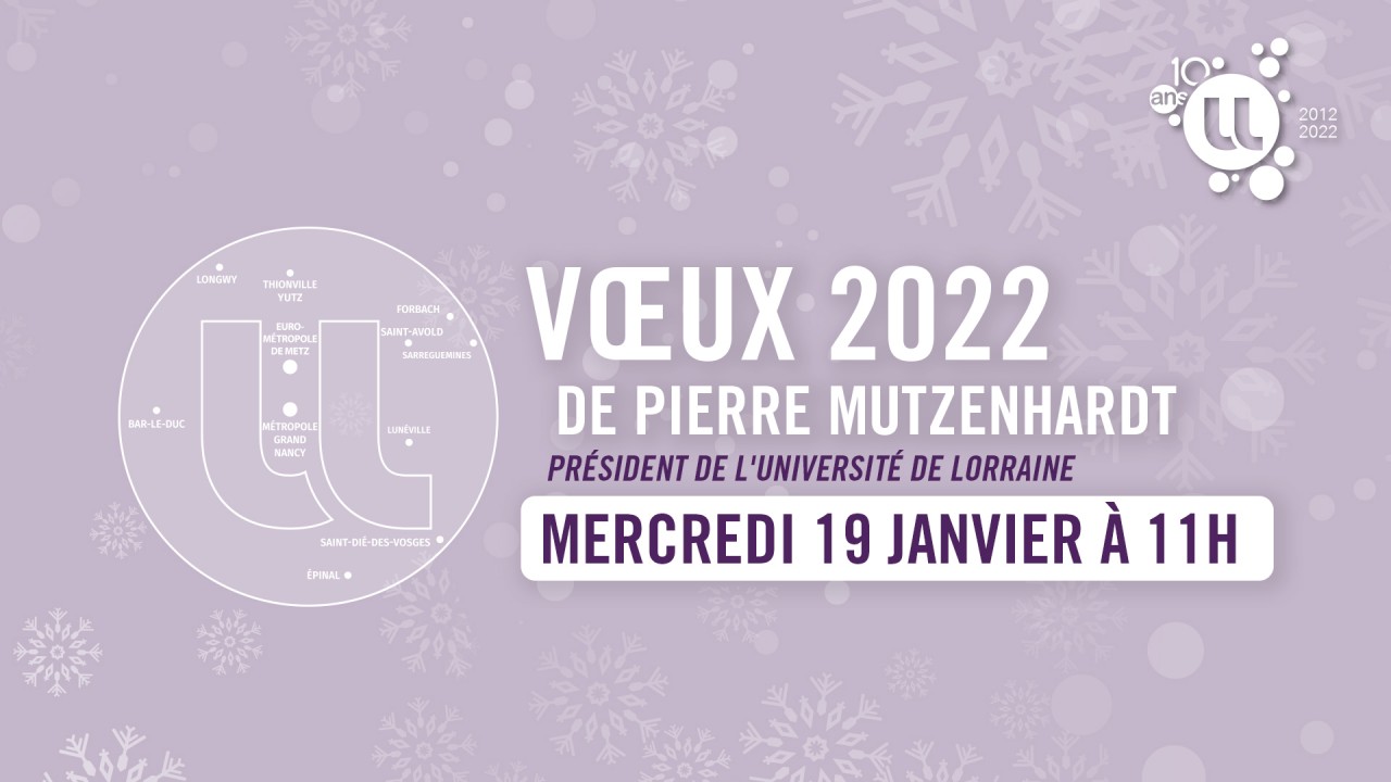 Pierre Mutzenhardt, Président de l'Université de Lorraine, a le plaisir de vous inviter à participer à la cérémonie des vœux 2022 de l'Université de Lorraine.