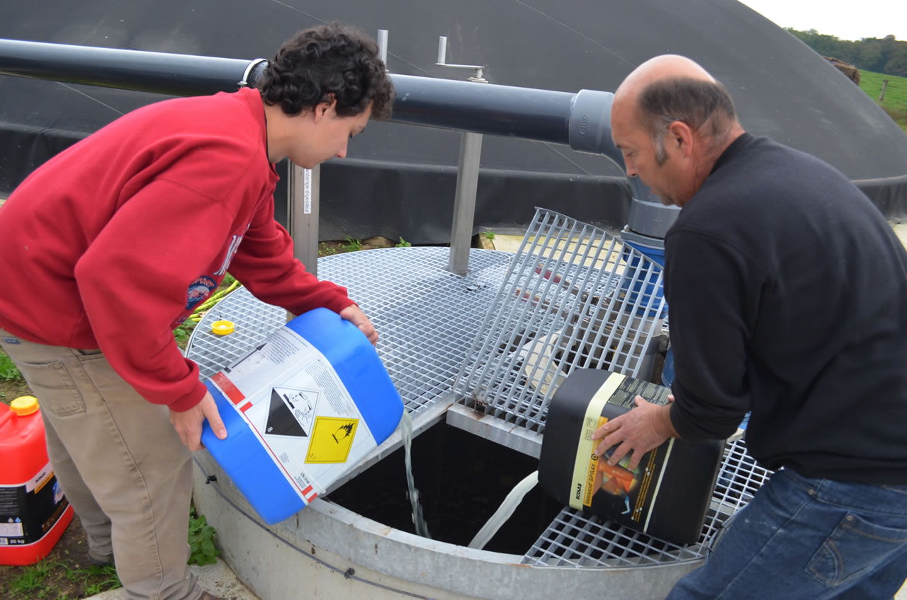 Sur place un technicien et un assistant ingénieur utilisent le laboratoire pour tester différents mélanges destinés à la méthanisation. Après avoir approfondi l’exploitation des fumiers et des lisiers, ils explorent la possibilité d’adjoindre du lactoserum issu de l’exploitation fromagère. Autant d’opportunités de valoriser ce qui est encore souvent considéré comme des déchets.