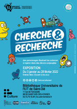 L’exposition « Cherche & Recherche » propose des illustrations mettant en scène la recherche sous la forme de petits personnages à identifier dans des décors surpeuplés.