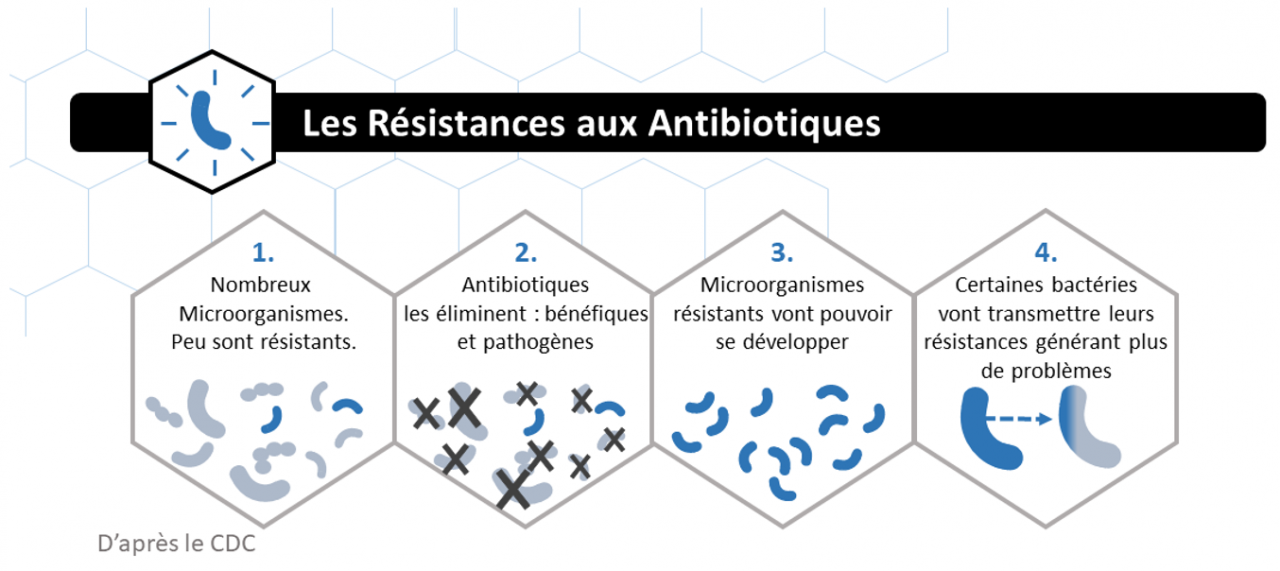 Au cœur de l’évolution rapide des microorganismes se trouve la problématique des résistances aux antibiotiques. Les antibiotiques sont des molécules produites naturellement par certains microorganismes et dont la fonction est d’éliminer ou d’inhiber la croissance de bactéries partageant le même environnement. De nombreux antibiotiques ont été découverts à partir des années 1940 et ont été massivement utilisés par l’homme depuis. Leur usage excessif en thérapie humaine et vétérinaire mais également comme promoteurs de croissance animale a conduit à l’émergence de bactéries résistantes aux antibiotiques. Au départ, seules quelques souches bactériennes sont naturellement résistantes aux antibiotiques, mais sous la pression d’usage de ceux-ci, de nombreuses souches ont acquis des résistances. Celles-ci passent par différentes stratégies comparables au camouflage, blindage, brouillage, esquive. C’est l’ADN qui est le support moléculaire de ces résistances grâce à ses régions codantes : les gènes. Ils peuvent donc être transmis à la descendance de l’organisme résistant. Il est également possible pour un organisme résistant de disséminer sa résistance en transférant une partie de son ADN à une bactérie sensible, particulièrement en présence de la pression de sélection antibiotique. Un de ces mécanismes, "la conjugaison" est exploré au laboratoire pour en connaitre les moindres détails au niveau moléculaire et au niveau cellulaire.
