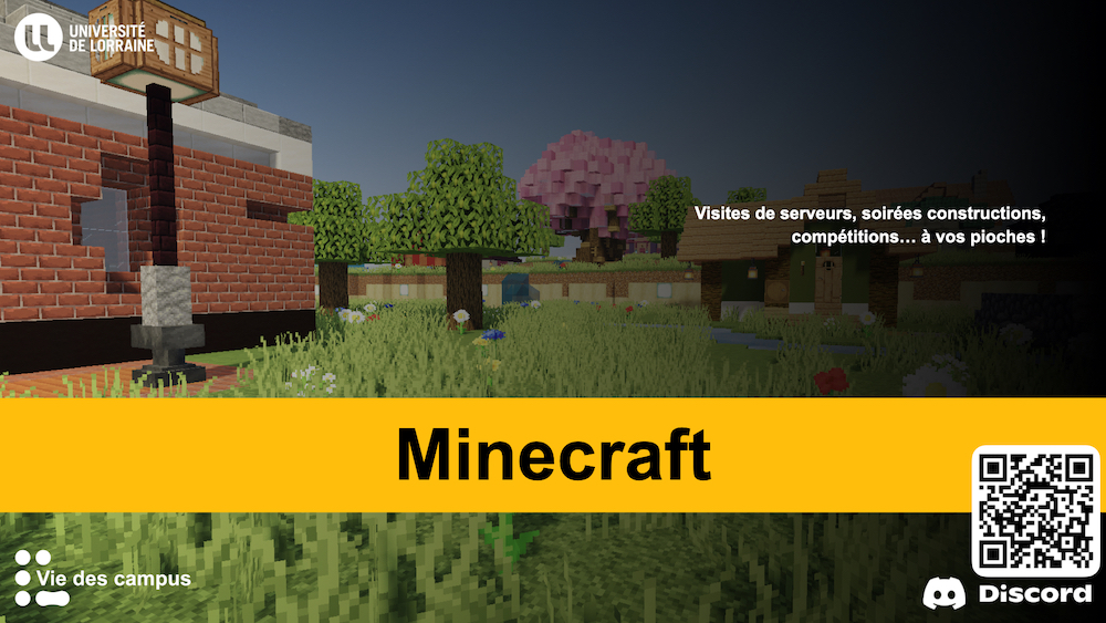 L’occasion de (re)découvrir Minecraft, un des jeux les plus populaire et ouvert de tous les temps ! De nombreuses activités sont prévues telles que des visites de serveurs, des soirées constructions et des compétitions, le tout en vocal.