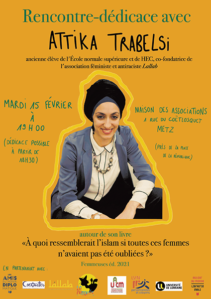 Ancienne élève de l'École normale supérieure et de HEC, Attika Trabelsi a participé il y a une dizaine d'années à la création de l'association féministe et antiraciste Lallab (www.lallab.org). Récemment, elle a fondé sa maison d'édition où a été publié son livre À quoi ressemblerait l’islam si toutes ces femmes n’avaient pas été oubliées ?, Femmeuses éd. 2021, www.femmeuses.fr. Préfacé par Malika Hamidi, docteure en sociologie de l'École des hautes études en sciences sociales, cet ouvrage retrace la vie de 15 femmes qui avaient contibué, entre le VIème et le XVIIème siècles, à l'essor et au développement du monde musulman : scientifiques, amirale de marine, cheffes politiques, etc. Ces biographies aident à corriger une vision patriarcale de l'histoire dont les femmes ont été évincées, en islam comme d'ailleurs dans la plupart des autres religions et régimes.