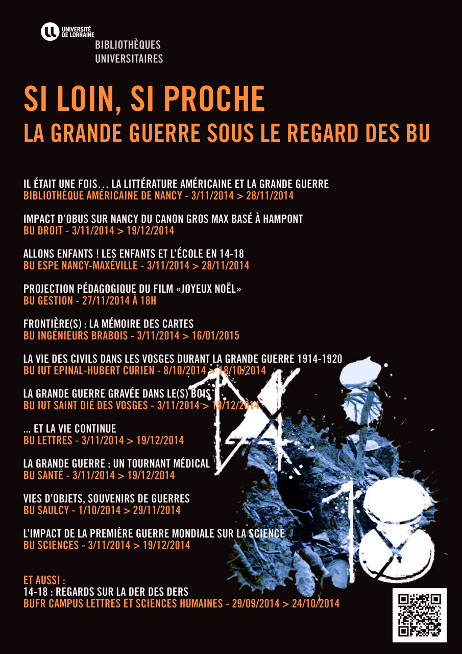 Tout au long du Mois de l’exposition, douze bibliothèques universitaires proposent des expositions autour du thème commun de la Première Guerre Mondiale. « Chaque équipe a pris en charge son exposition à partir de son fonds documentaire et de ses ressources » explique Frédérique Peguiron, responsable de la bibliothèque de lettres et sciences humaines de Nancy et chargée de l’animation culturelle au sein de la Direction de la documentation et de l’édition (DDE).
