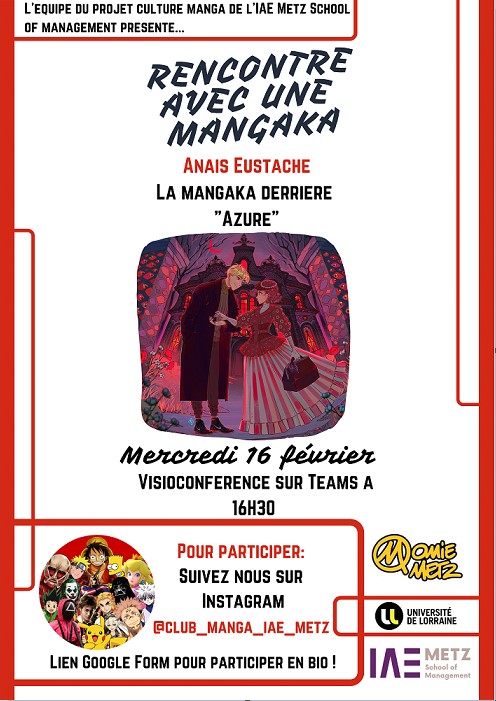 Le club manga de l'IAE Metz Business School of Management vous propose une rencontre avec la mangaka Anaïs Eustache, a.k.a. Kichii, le mercredi 16 février 2021, sur Teams. Elle nous présentera son parcours, ses mangas ainsi que ses futurs projets. Pour participer, inscrivez vous sur ce lien : https://docs.google.com/forms/d/e/1FAIpQLSd4-4QHxuCEsB7sz0hfxQ9aWh5Ir6_Wp8_1MqBhOiUbPfxzoA/viewform?usp=sf_link
