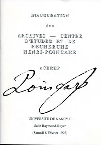 Les Archives Henri-Poincaré ont 30 ans : un tel anniversaire appelle un exercice de rétrospection. C’est le 8 février 1992, qu’elles étaient inaugurées à Nancy par le président de l'Université Nancy II, René Hodot, sous la dénomination d’Archives – Centre d’Études et de Recherche Henri-Poincaré, comme équipe recommandée par la DRED (Direction de la recherche et des études doctorales du ministère de l’Education nationale). Elles bénéficiaient d’un comité de patronage prestigieux : le petit-fils du savant, François Poincaré ; le mathématicien Jean Dieudonné (Académie des sciences), le philosophie Henri Gouhier (Académie française) ; l’historien Jean Schneider (Académie des inscriptions et belles lettres). La composition de ce comité reflétait autant l’interdisciplinarité de Poincaré, qui fut tout à la fois mathématicien, physicien, astronome, philosophe, et celle du projet fondateur du laboratoire.