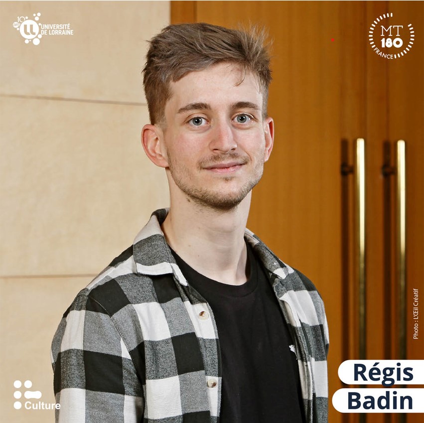 Régis a voulu participer au concours MT180 pour son aspect de vulgarisation scientifique. Il aime communiquer à propos de ses recherches et de son travail de manipulation au laboratoire afin de mieux expliquer ce que peut être le métier de chercheur. Il travaille sur la réhydratation des poudres alimentaires. Il analyse leur surface pour étudier comment elles évoluent en fonction des conditions environnementales, de température et d’humidité. C’est à ses yeux un sujet porteur car avec des besoins en alimentations croissants, ses poudres faciles à transporter sont prometteuses pour l’avenir. En dehors de sa thèse, Régis aime faire du sport, comme de la course ou du badminton, pour sortir du cadre de ses recherches et se vider l’esprit.