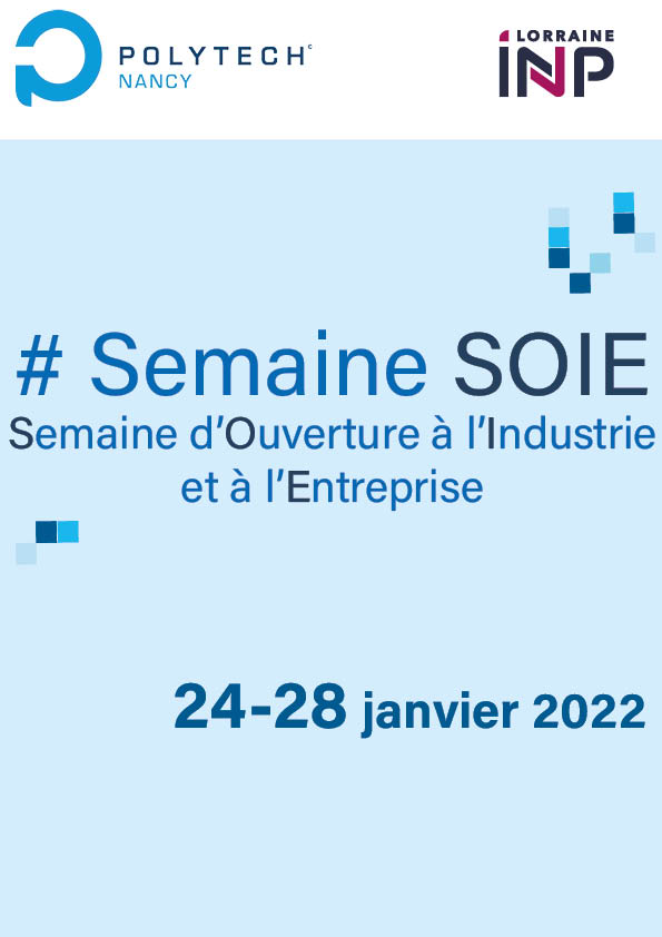 Comme chaque année, Polytech Nancy a organisé la Semaine SOIE* (Semaine d'Ouverture à l'Industrie et à l'Entreprise) du 24 au 28 janvier 2022 avec des activités innovantes pour ses 140 élèves de 1ère année :