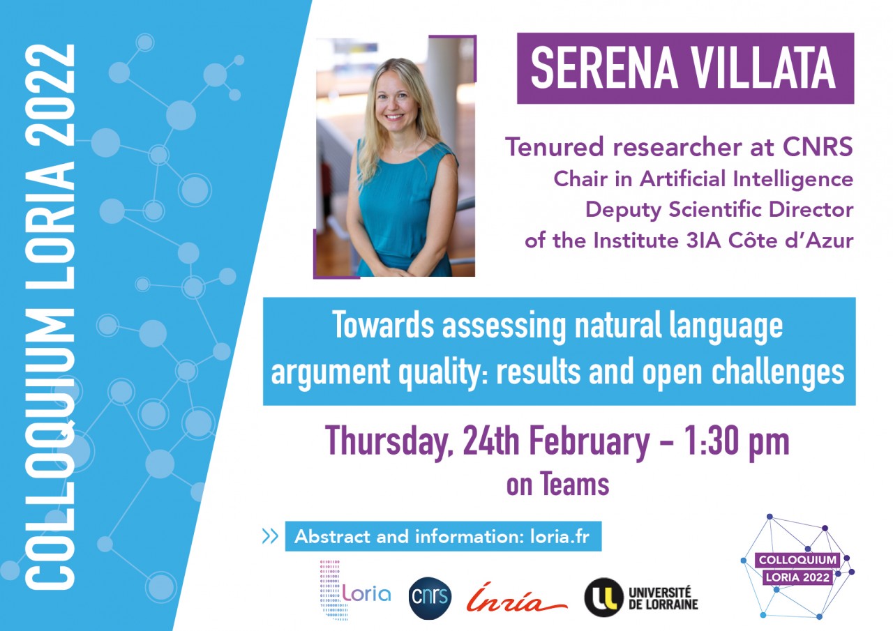 Nous sommes heureux d’accueillir Serena Villata, chercheuse CNRS au I3S, avec une présentation en anglais intitulée “Towards assessing natural language argument quality: results and open challenges”.