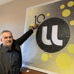 | Salon Oriaction : pour les 10 ans de l'Université de Lorraine, une fresque collaborative a été réalisée par les participants. Ici, le Président Pierre Mutzenhardt colle le dernier autocollant. |