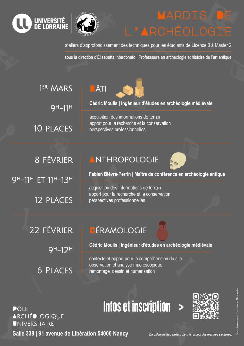 Ces ateliers ont lieu le mardi au Pôle Archéologique Universitaire sous la direction d’Elisabetta Interdonato, Professeure d’archéologie classique (en collaboration avec Fabien Bièvre-Perrin, MCF en Réception de l’antiquité ; Cédric Moulis, Ingénieur d’études en Archéologie Médiévale-PAU).