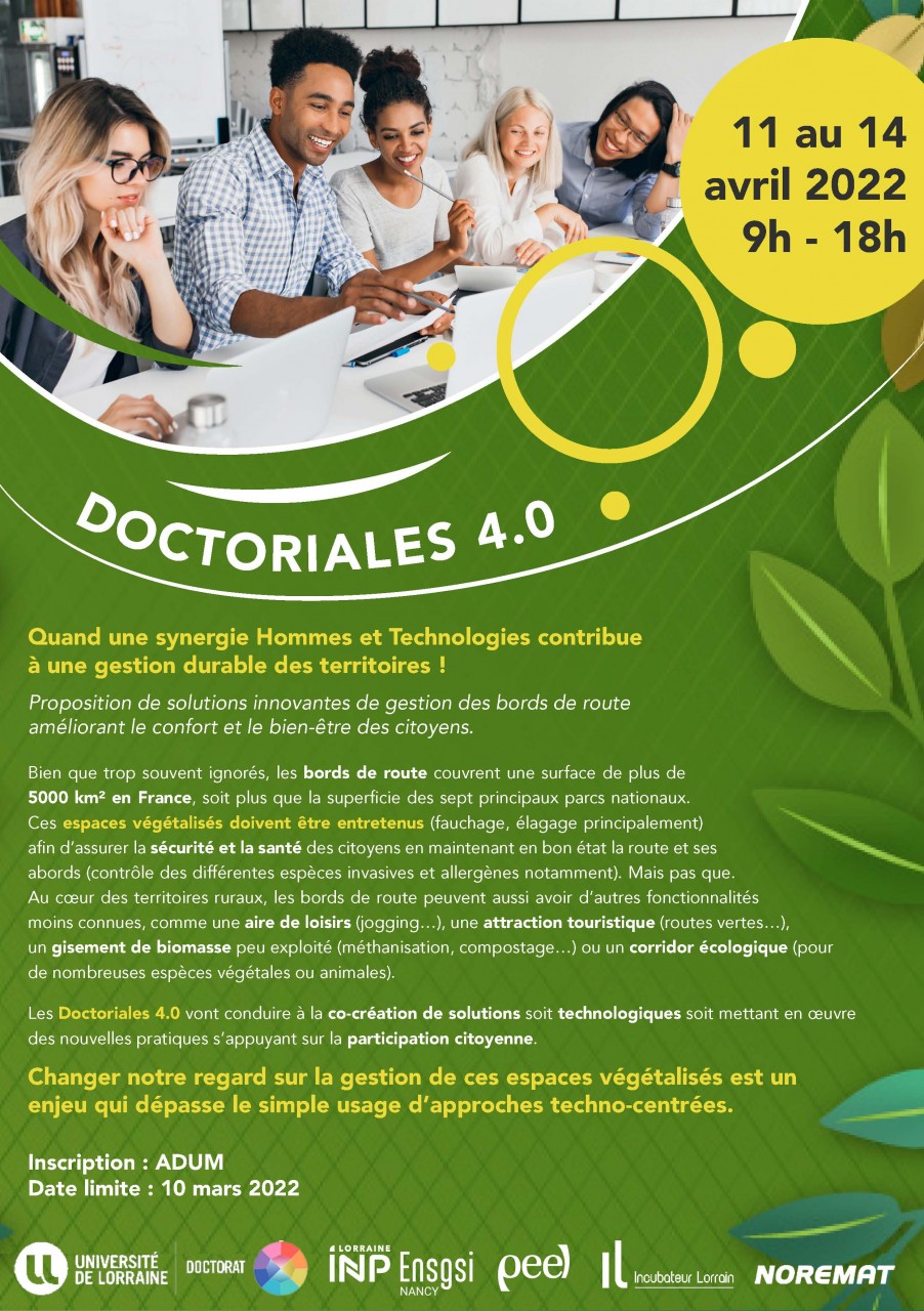 Du 11 au 14 avril 2022, tous les Doctorants de l’Université de Lorraine, années et disciplines de recherche confondues, sont invités à participer au séminaire annuel des Doctoriales 4.0