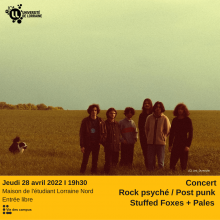 Stuffed Foxes (rock psyché): Six vingtenaires de Tours – dont 3 guitaristes ! –, qui bercent dans le psyché/shoegaze et les attaques noisy étirées jusqu’à l’abandon. Abandon des postures et conventions. Abandon du corps quand l’émotion ne sait plus donner de la tête et que le pied quitte le fil de ces rythmes cabossés.