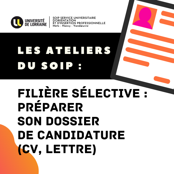 Vous souhaitez poursuivre vos études dans une filière sélective et vous voici arrivé au moment d’élaborer votre dossier de candidature. Afin de mettre tous les atouts de votre côté, le SOIP vous propose un nouvel atelier, dont les principaux objectifs sont de vous :