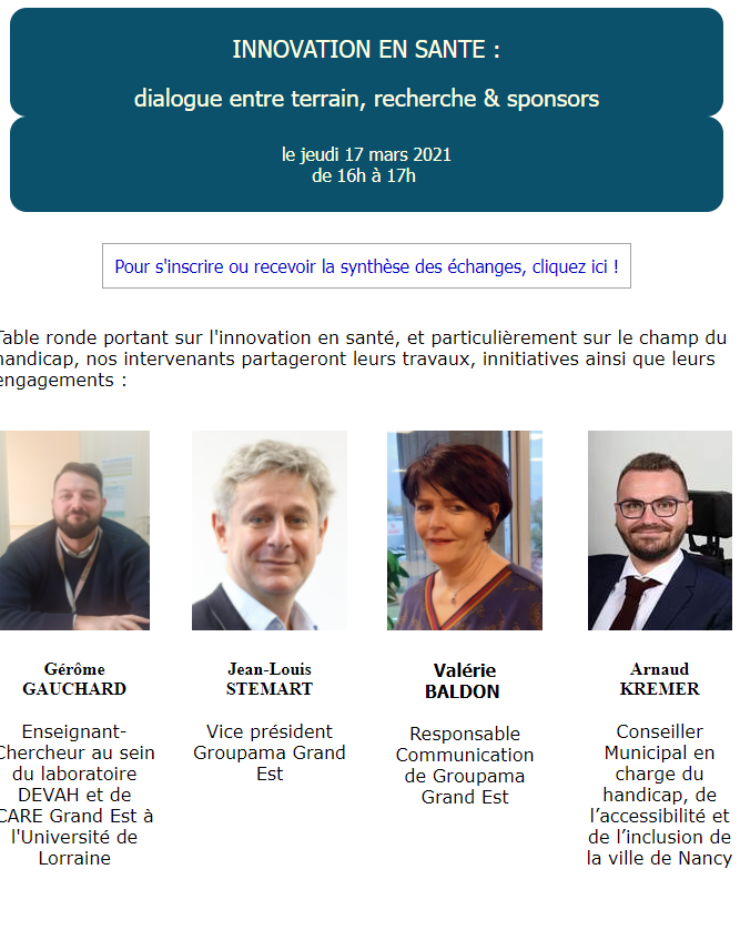 La Mission Handicap et les communautés Egalite-Diversité-Inclusion et Autonomie & Qualité de vie de la DEPAS, ainsi que Groupama Grand Est, organisent une table ronde en présentiel ou en virtuel : Innovation dans le sport & la santé : dialogue entre recherche, terrain et sponsors.