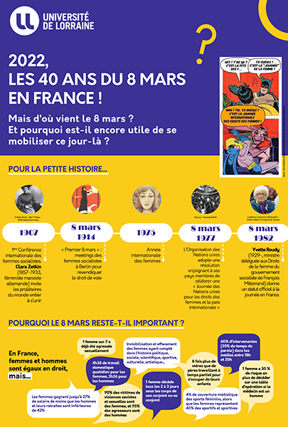 A l'occasion de la journée internationale des droits des femmes du 8 mars 2022, la cellule Egalité-Diversité-Inclusion de l'UFR Sciences humaines et sociales - Metz a réalisé une exposition sur les thématiques liées à l'égalité femmes-hommes.