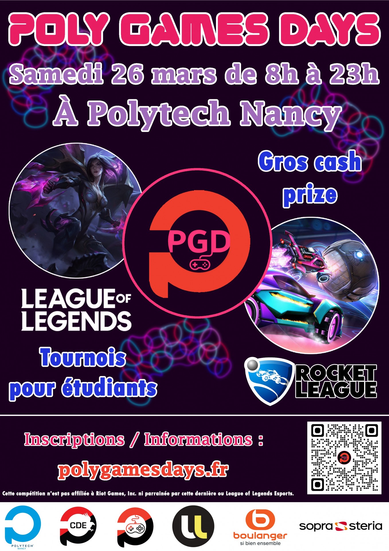 Cette année, les PGD se dérouleront le samedi 26 mars de 8h00 à 23h00 à Polytech Nancy. Deux tournois auront lieu : un sur League of Legends et un sur Rocket League.
