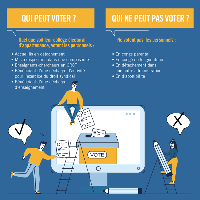 La réglementation indique que certains enseignants ne sont pas inscrits d’office sur les listes électorales et doivent faire une demande spécifique d’inscription afin de pouvoir exercer leur droit de vote. C’est notamment le cas des personnels en CDD ou non qui ne sont ni affectés en position d’activité, ni mis à disposition ou détachés dans l’établissement, mais qui y effectuent un service d’enseignement d’au moins 64 HETD sur l’année universitaire. Cette même condition s’applique aux ATER, doctorants contractuels avec enseignement, maîtres de conférences stagiaires, MAST, chargés d’enseignement vacataires, lecteurs et maîtres de langue.