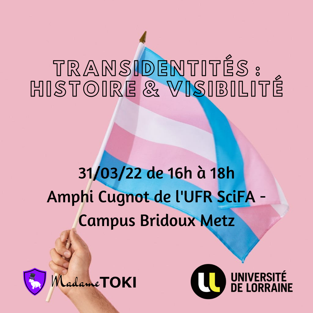 Dans le cadre de la Journée internationale de la visibilité transgenre, Sasha Meraïhi, auteure-militante transgenre et étudiante à l'UFR SciFA de Metz présente une conférence intitulée Transidentités : histoire & visibilités, qui abordera l'histoire et la représentation des transidentités, le jeudi 31 mars 2022 de 16h à 18h à l'Amphi Cugnot de l'UFR SciFA - Campus Bridoux Metz.