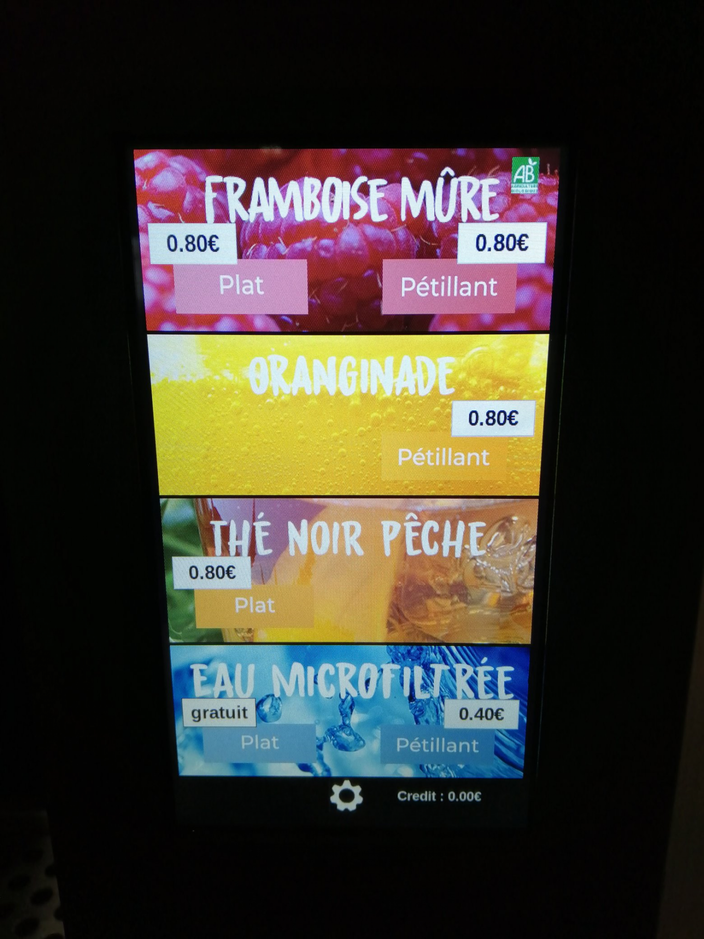 L’eau délivrée peut être, au choix, pétillante et/ ou aromatisée, pour le prix de 40 à 80 centimes par contenant de 33cl. Le règlement s’effectue par carte bancaire directement sur la machine.