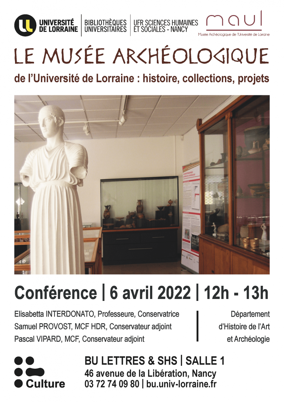 Dans le cadre des Journées Arts & Culture dans l'Enseignement Supérieur (JACES), la BU Lettres & SHS accueillera la conférence "Le musée archéologique de l'Université de Lorraine (MAUL): histoire, collections, projets", organisée avec l'UFR SHS et le Département d’Histoire de l’Art et Archéologie.