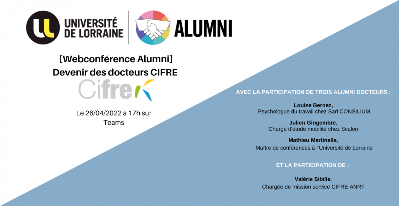 Le réseau Alumni docteurs de l'Université de Lorraine organise, le 26 avril 2022 une webconférence dédiée à la poursuite de carrières après une thèse CIFRE. RDV à 17 h sur Teams !