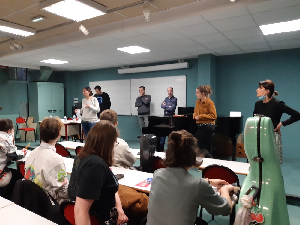 Après un accueil assuré par Céline CARENCO, Responsable de la licence et le SuOIP, une trentaine d’étudiants de licence ont découvert les parcours des « anciens » qui travaillent désormais dans l’enseignement de la musique (Roxane, Professeure agrégée de musicologie en Collège dans les Vosges et Geoffroy, Professeur de saxophone à Gérardmer) ou dans un tout autre domaine (Aurélien, artisan électricien et Arnauld, consultant en recrutement et tout naturellement enseignant vacataire en PPP).