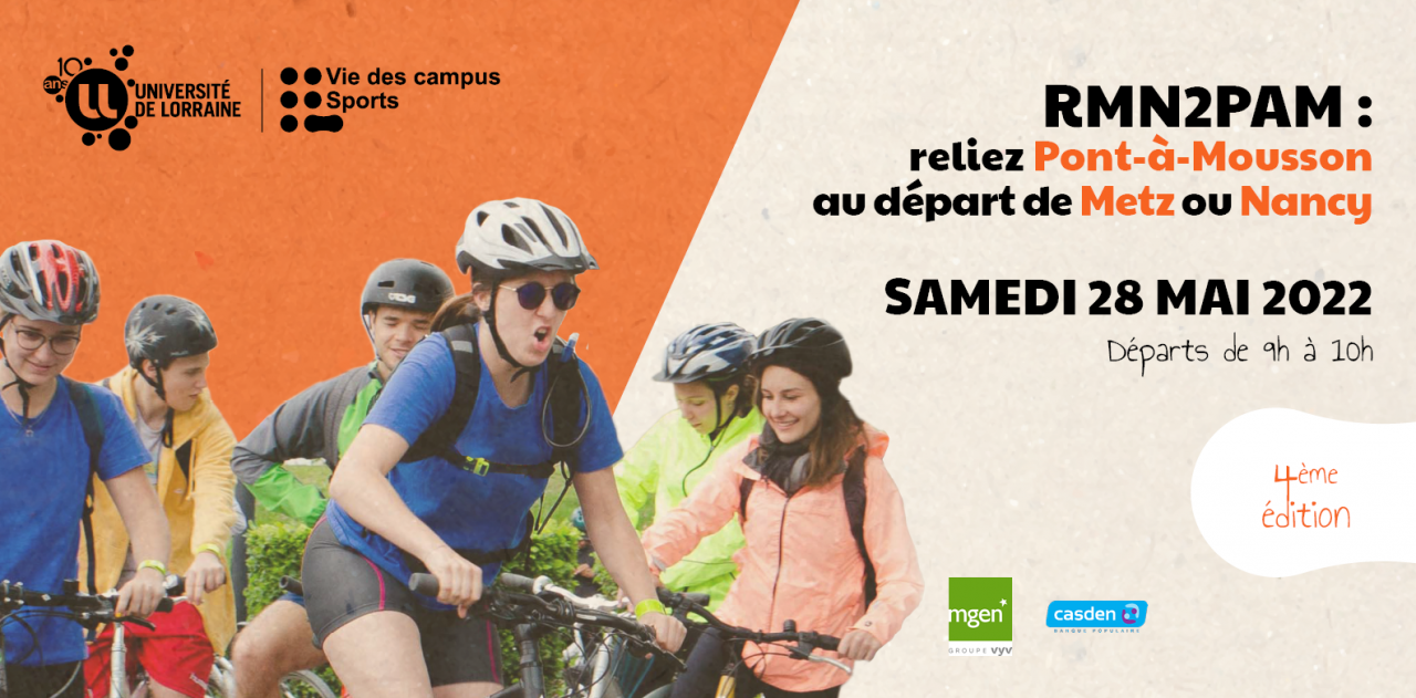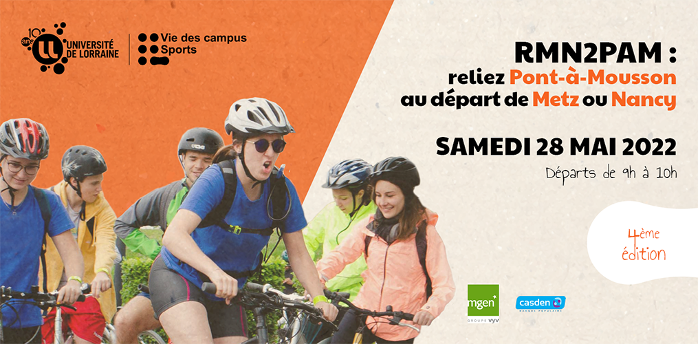 L'Université de Lorraine a le plaisir de convier les étudiants et les personnels de l'établissement, ainsi que leurs familles, à la cyclo-rando RMN2PAM 2022 qui se tiendra samedi 28 mai.