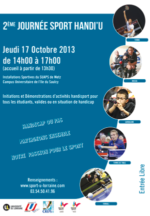 Cette seconde journée de sensibilisation aux pratiques handisport se déroulera jeudi 17 octobre 2013 à partir de 14h dans les installations sportives du SUAPS, Ile du Saulcy à Metz.