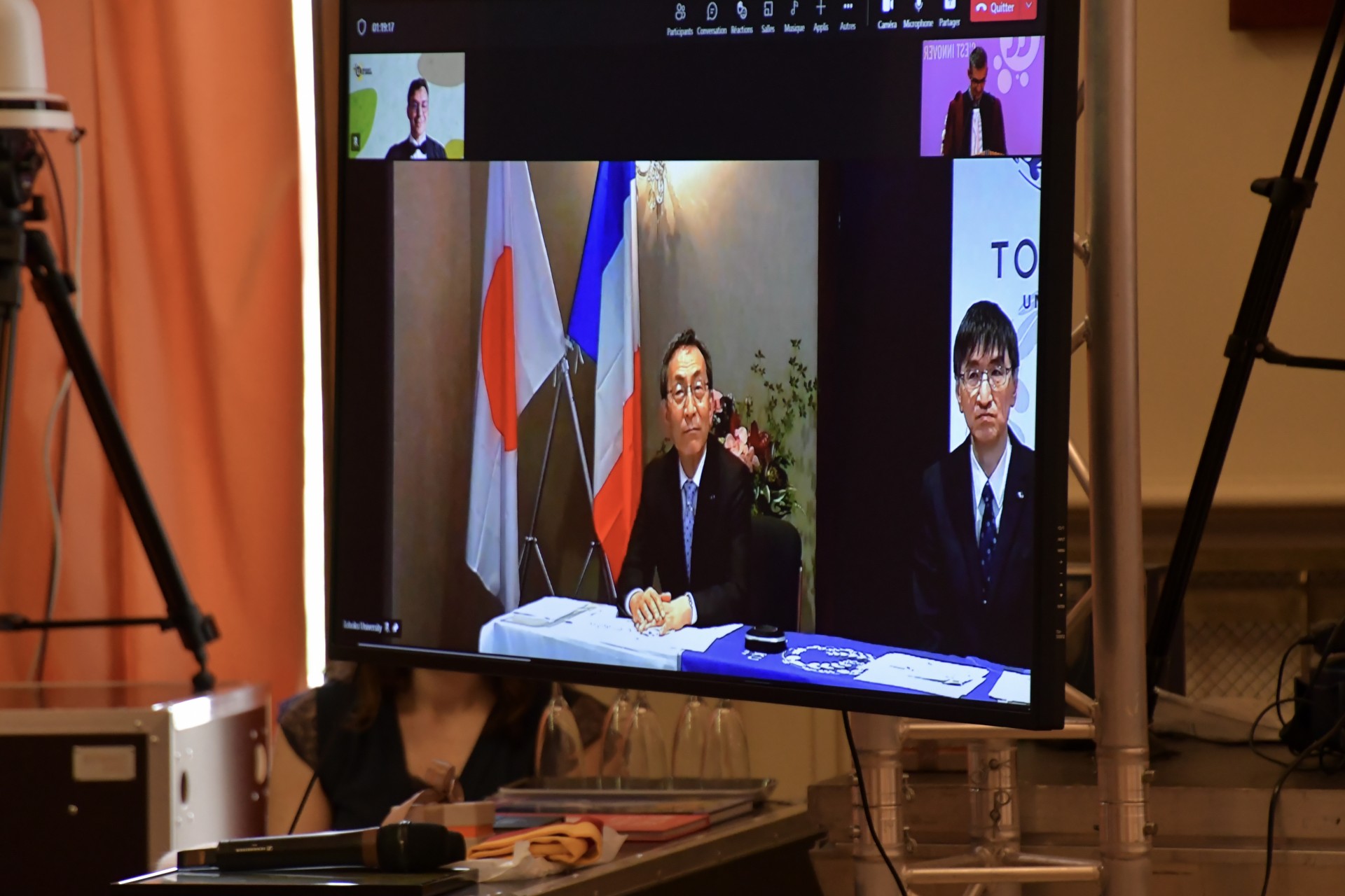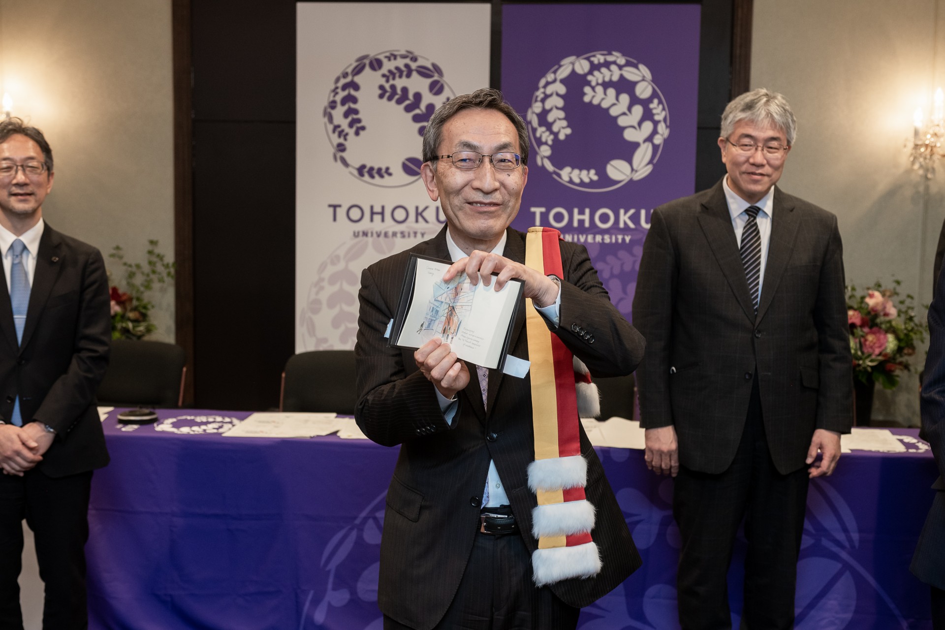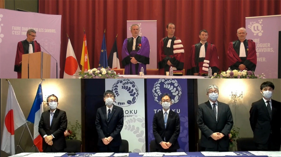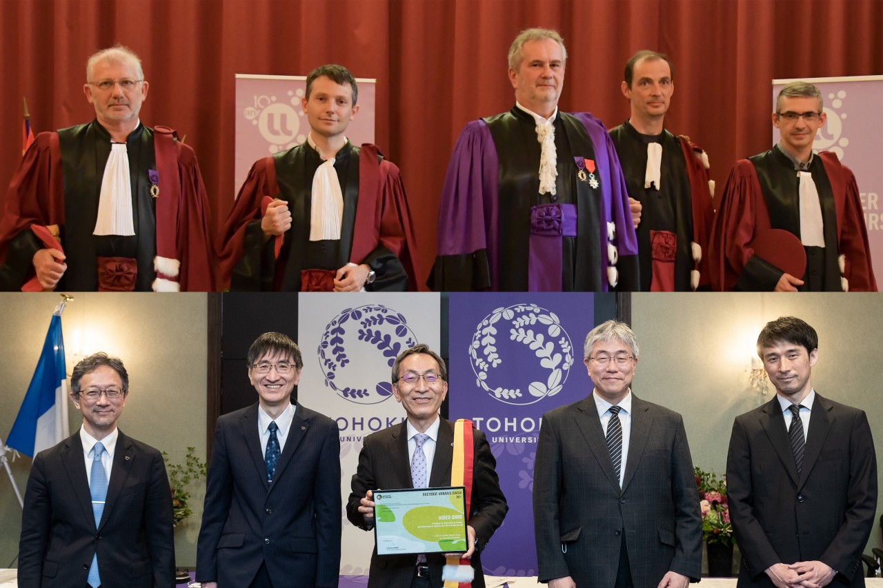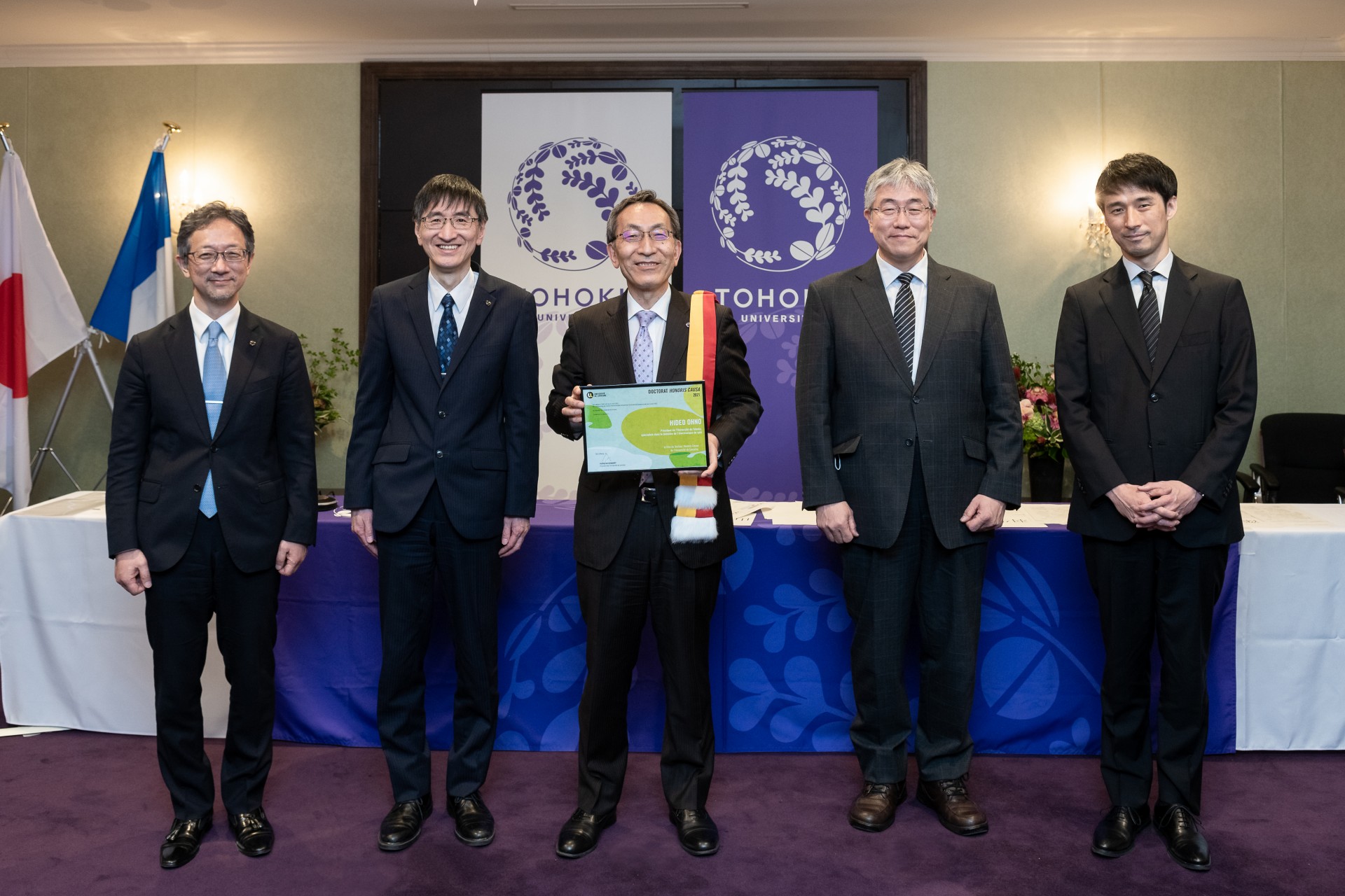 Monsieur Ohno était accompagné d'une délégation de l'Université de Tohoku composée de Toshiya Ueki, vice-président exécutif des affaires générales, financières et des relations internationales, Masahiro Yamaguchi, vice-président pour la réforme de l'enseignement supérieur et de l'engagement international, Takahiro Hanyu, directeur de l'institut de recherche de communication électrique et Shunsuke Fukami, professeur à l'institut de recherche de communication électrique.