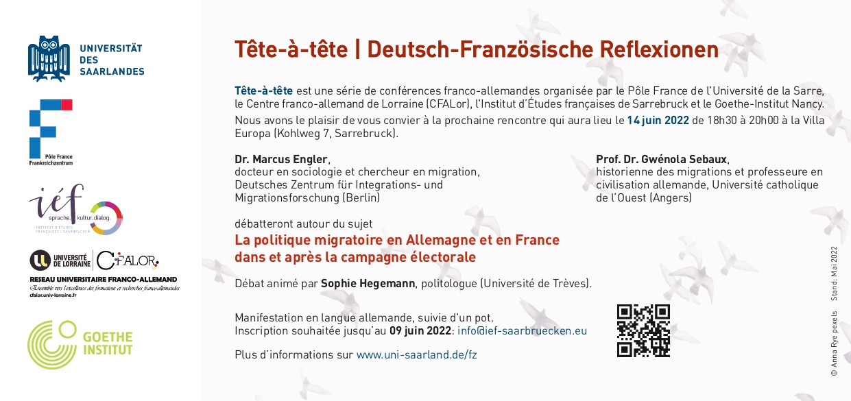 Tête-à-tête est une série de conférences franco-allemandes organisée par le Pôle France de l'Université de la Sarre, le Centre franco-allemand de Lorraine (CFALor), l'Institut d’Études françaises de Sarrebruck et le Goethe-Institut Nancy.